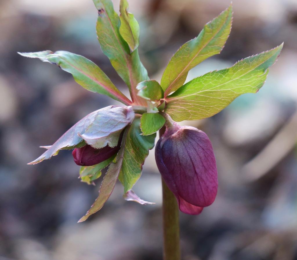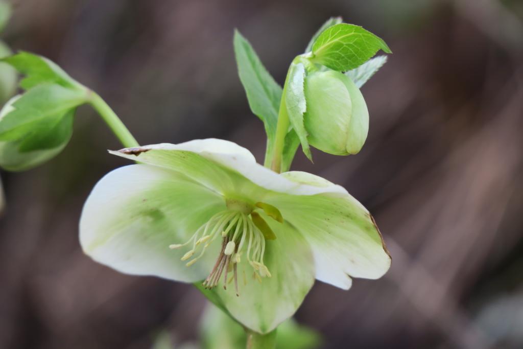 Hellebores come in a variety of colours – here a white one and a purple one about to open up.